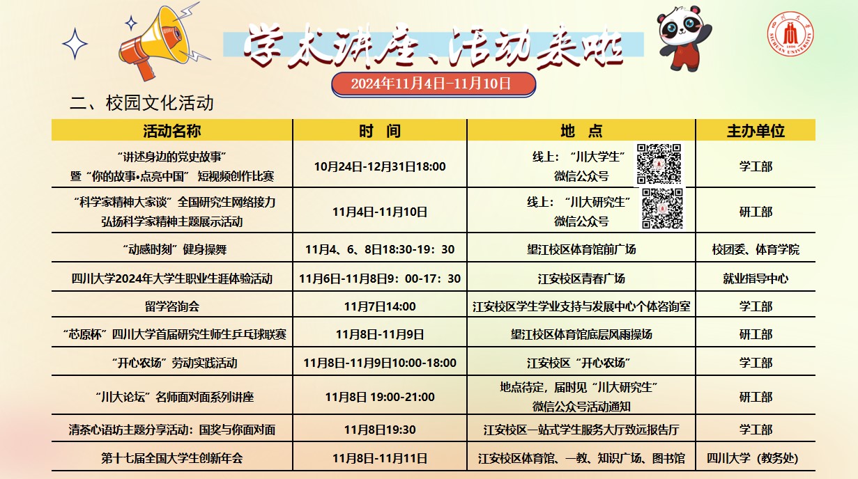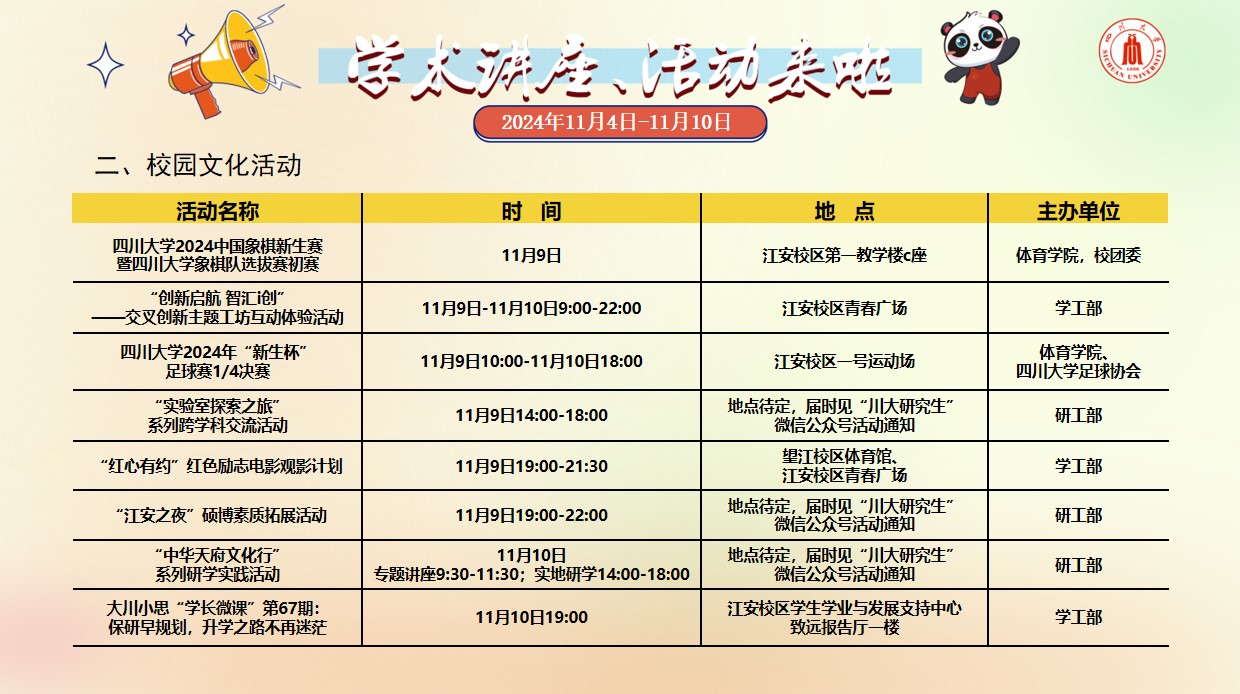 yl23411永利(集团)有限公司官网2024年11月4日-10日学术讲座及校园文化预告