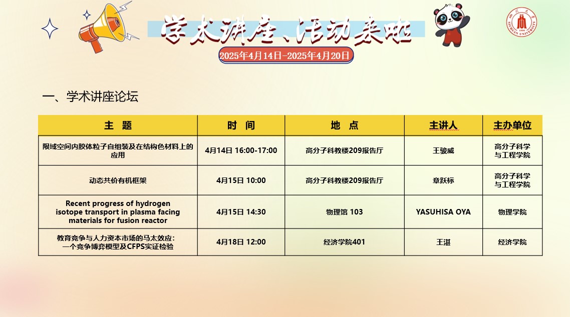 yl23411永利(集团)有限公司官网2025年4月14日-4月20日学术讲座论坛及校园文化活动预告
