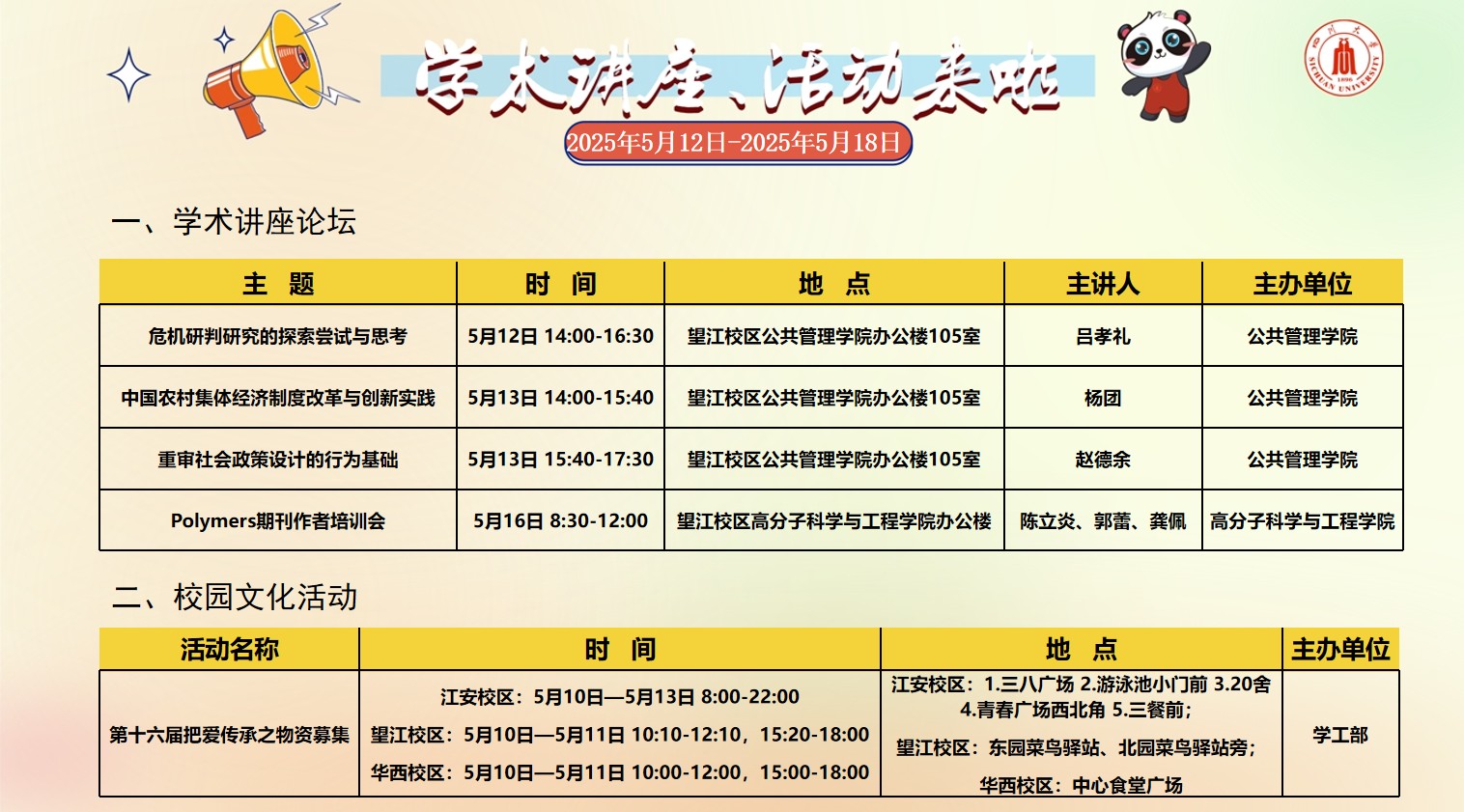 yl23411永利(集团)有限公司官网2025年5月12日-5月18日学术讲座论坛及校园文化活动预告