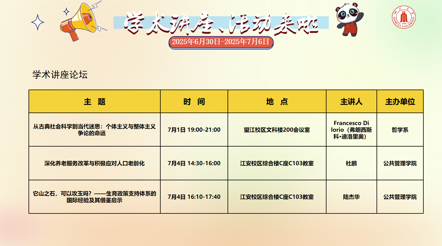 yl23411永利(集团)有限公司官网2025年6月30日-7月6日学术讲座论坛及校园文化活动预告