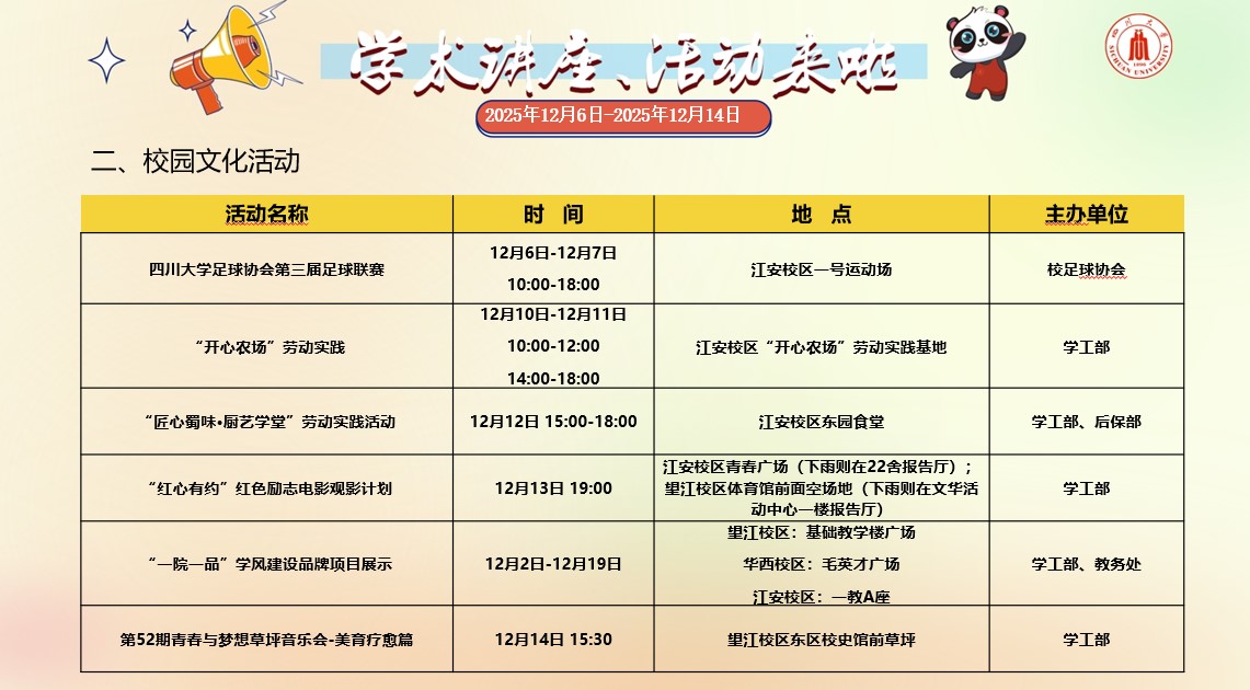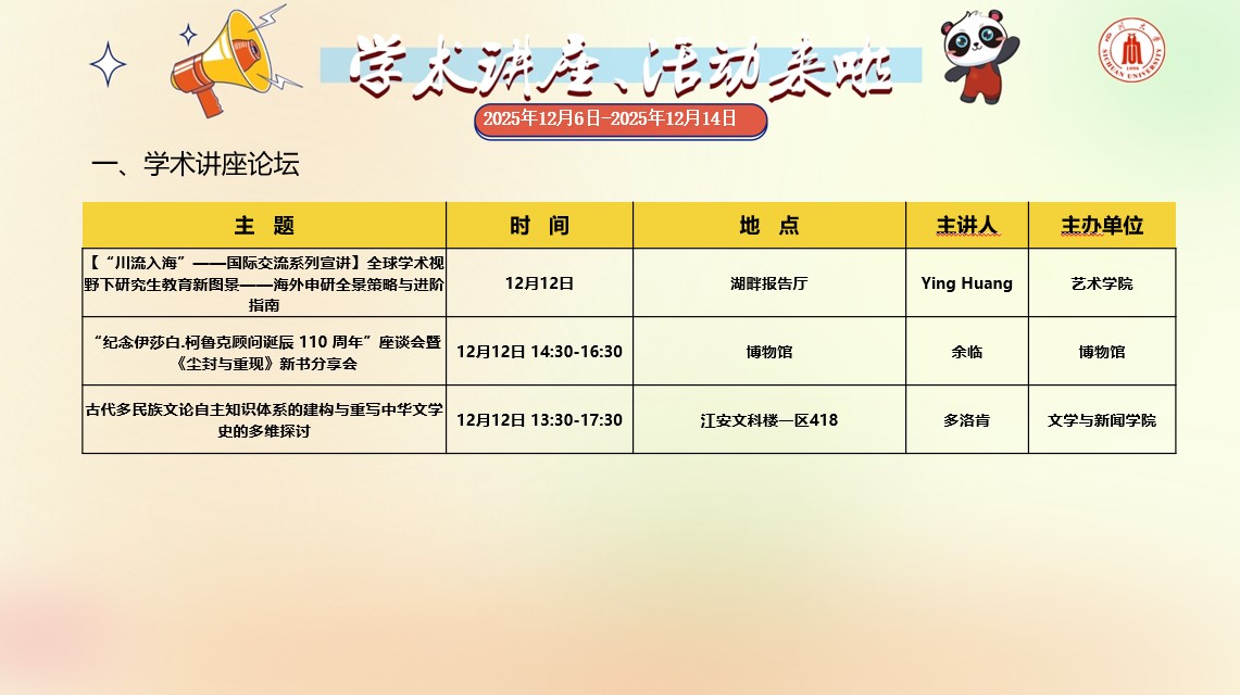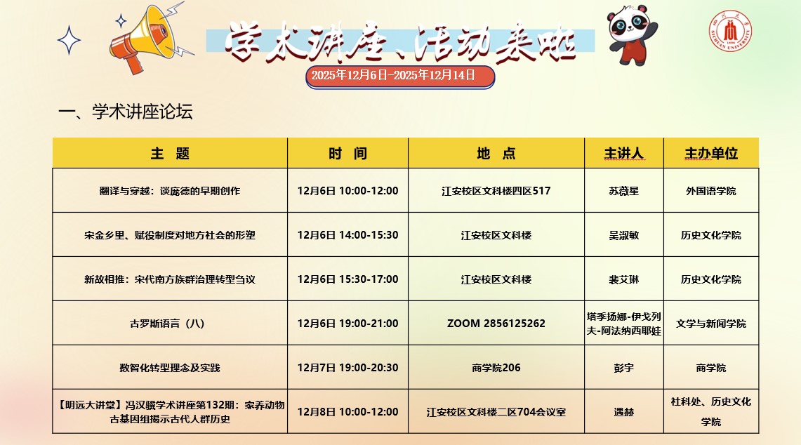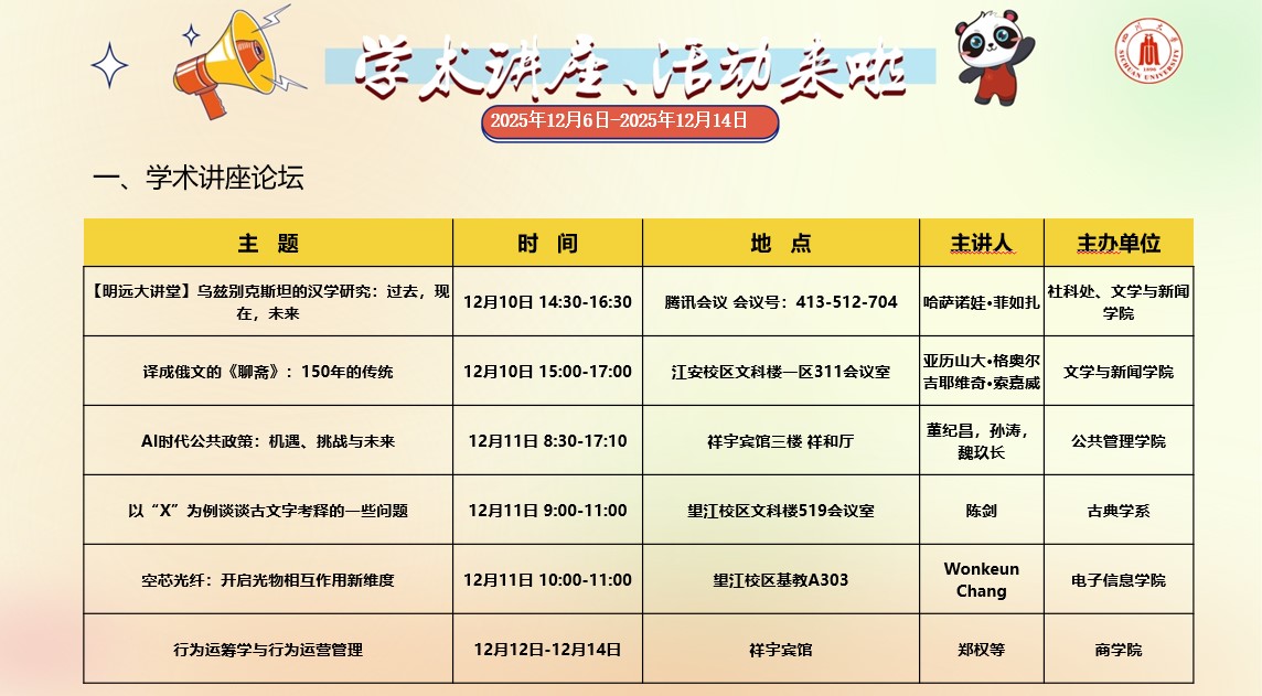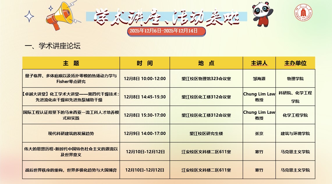 yl23411永利(集团)有限公司官网2025年12月6日-2025年12月14日学术讲座和校园文化活动预告