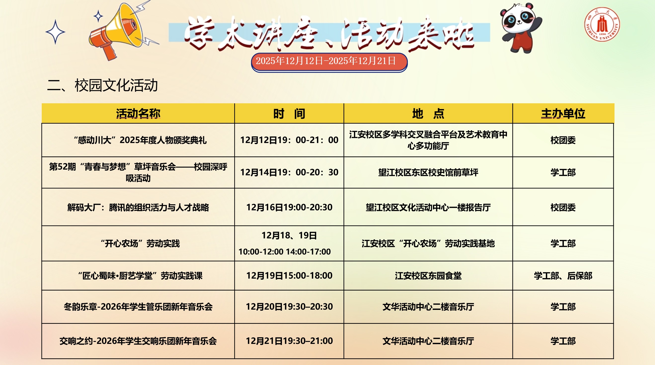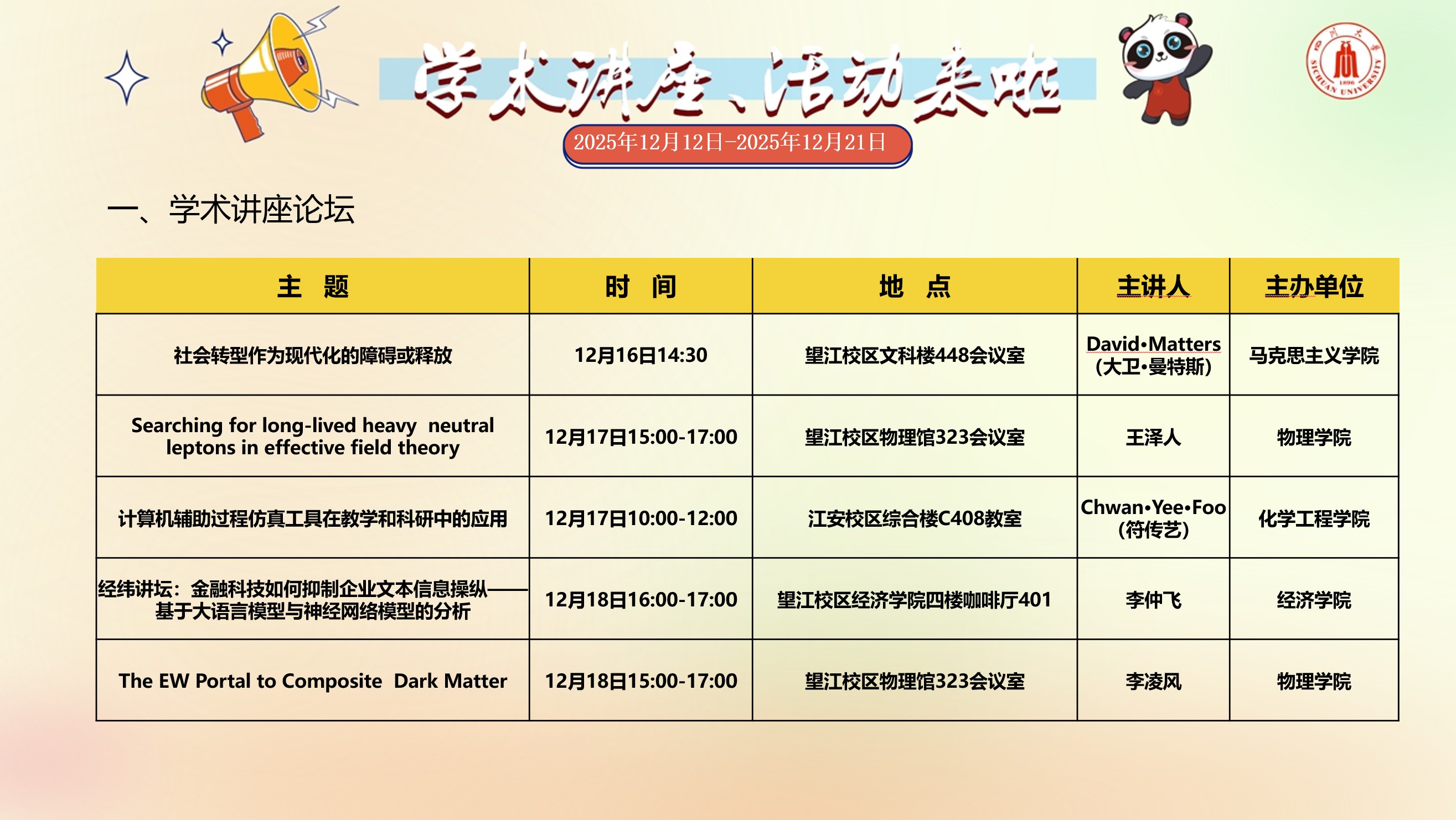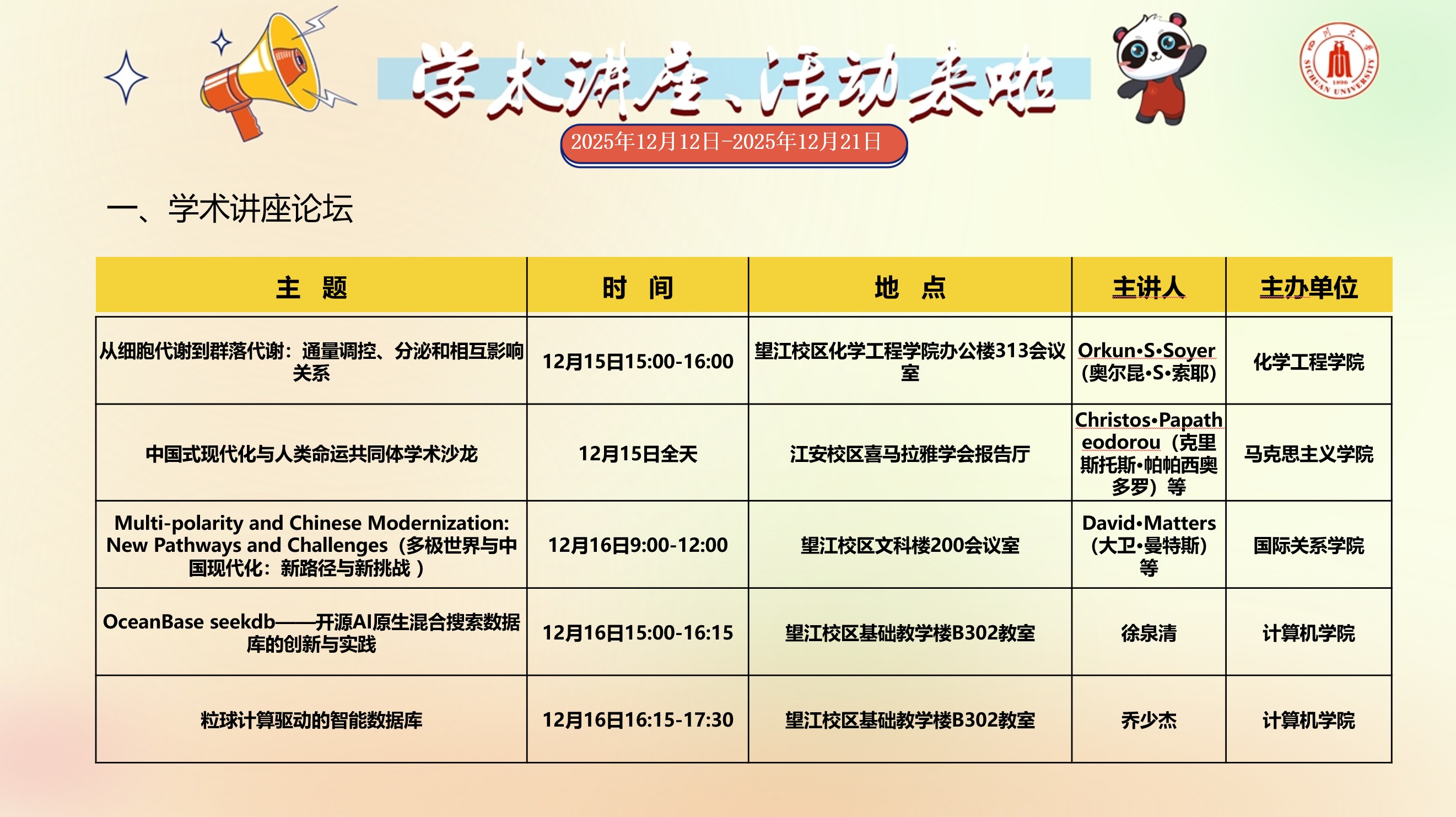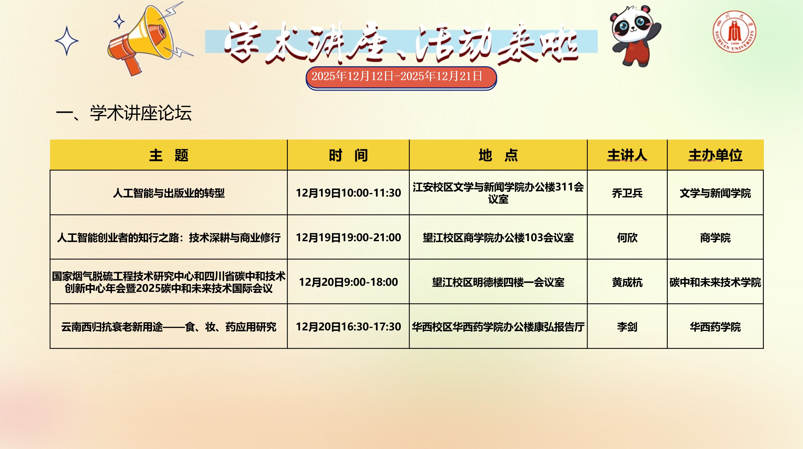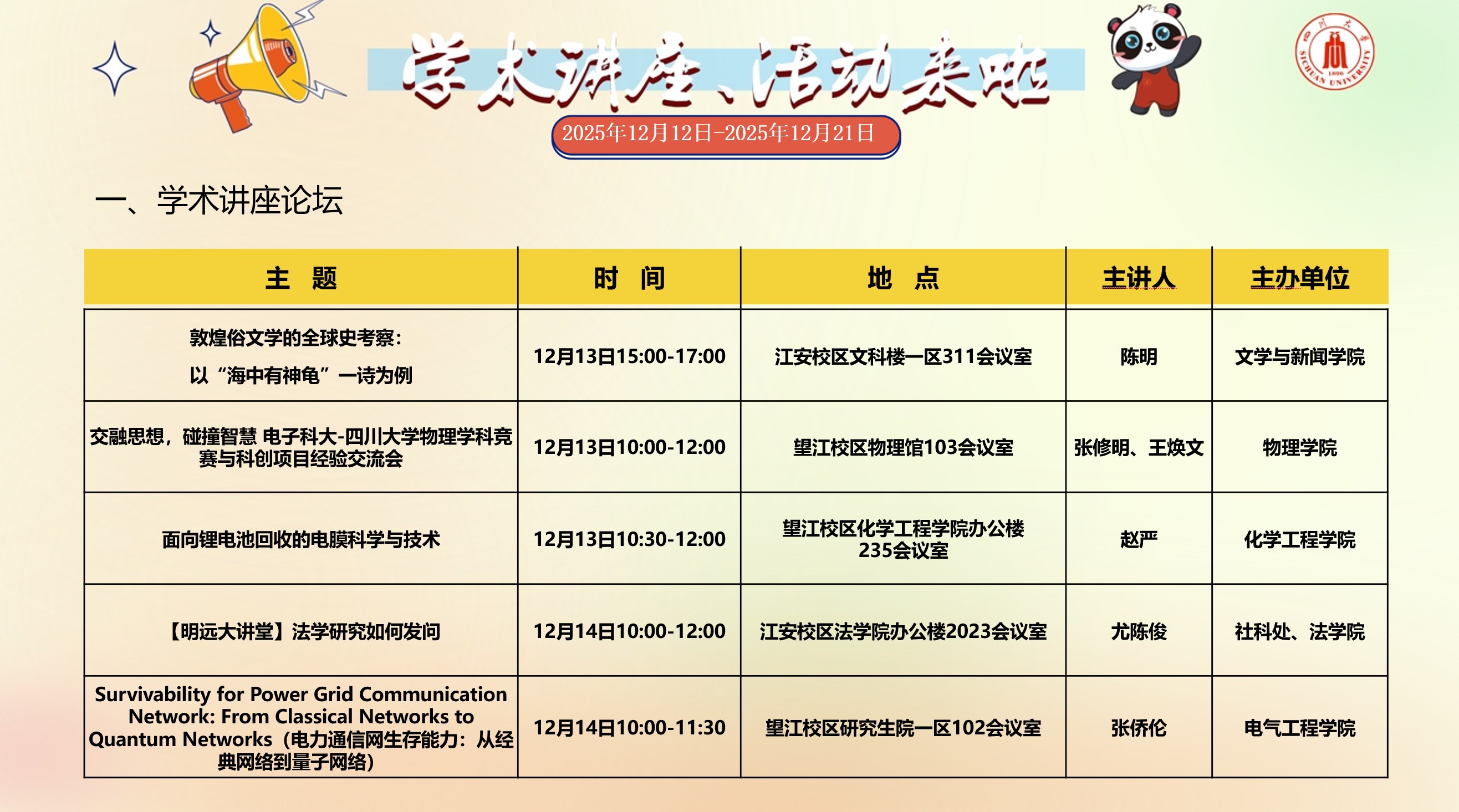 yl23411永利(集团)有限公司官网2025年12月12日—12月21日学术讲座和校园文化活动预告