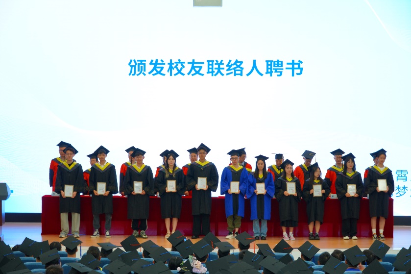 学院院长戴峰宣读四川省教育厅关于表彰2024届四川省优秀大学毕业生的文件和学院设立学院2024届校友联络人的决定。华国春、戴峰共同为学院获奖同学颁奖,出席典礼的领导、老师为2024届校友联络人颁发聘书。