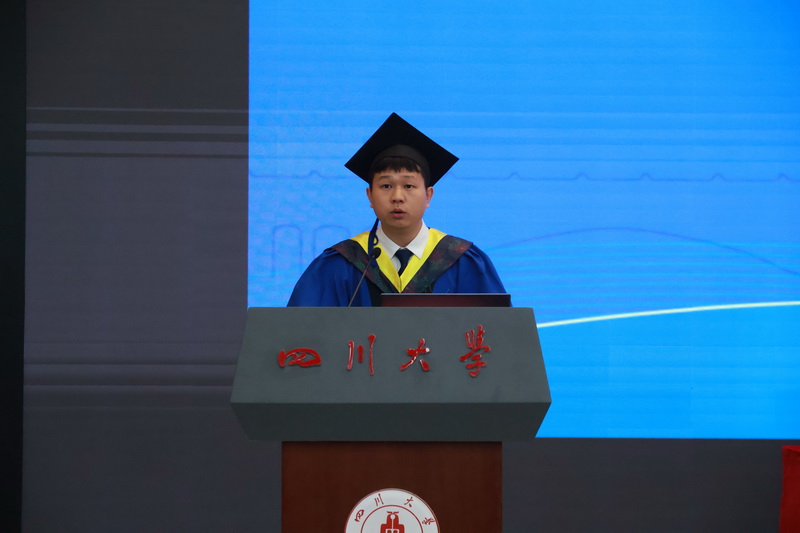 城乡规划专业康澳同学作为研究生毕业生代表发言。他分享了在学院求学八年的故事与选择,感恩母校的老师与同学,表示在奔赴城乡建设与生态保护广袤天地中将坚守初心,在平凡的岗位上挥洒青春热血。
