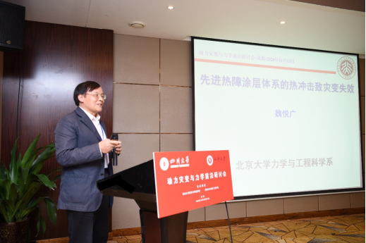 谢和平院士、魏悦广院士在会上先后做了特邀报告。谢和平院士以“工程扰动岩石动力学构想与初探”为报告主题,围绕煤矿开采动力学、深地科学、三维动态加载等工程问题中需要解决的一些动力灾变与力学问题逐一展开,溯源追本,阐明了动力灾变未来发展方向。魏悦广院士在报告中介绍了先进热障涂层体系中热冲击导致的灾变失效问题,他首先阐释了热震、热冲击、热烧蚀等几个重要概念,而后以近空间飞行器中的热防护涂层为例,介绍了材料体系、性能表征、损伤灾变、跨尺度力学行为等重要的力学问题以及研究进展。
