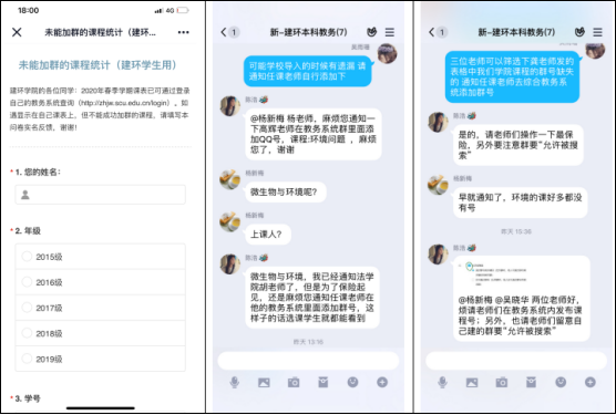为保证线上教学工作的顺利进行,确保每个细节都按照规定进行,建环学院对课程及教学平台也进行了梳理,如根据课程的设置差异进行了教学形式的分类统计,建议授课老师根据实际进行选用;对超星学习通、爱课堂、雨课堂、QQ群、微信群、慕课平台等教学平台也进行了试用,总结平台优缺点供授课教师参考。2月17日,学校教务处在综合教务系统中公布课程联络群后,建环学院立即着手跟踪学生加群情况,及时发布未能加入课程群的反馈问卷,收集不能成功加群的课程信息,通过教务处工作群与各学院的同事积极配合,联络任课老师帮助每一位学生顺利加群
