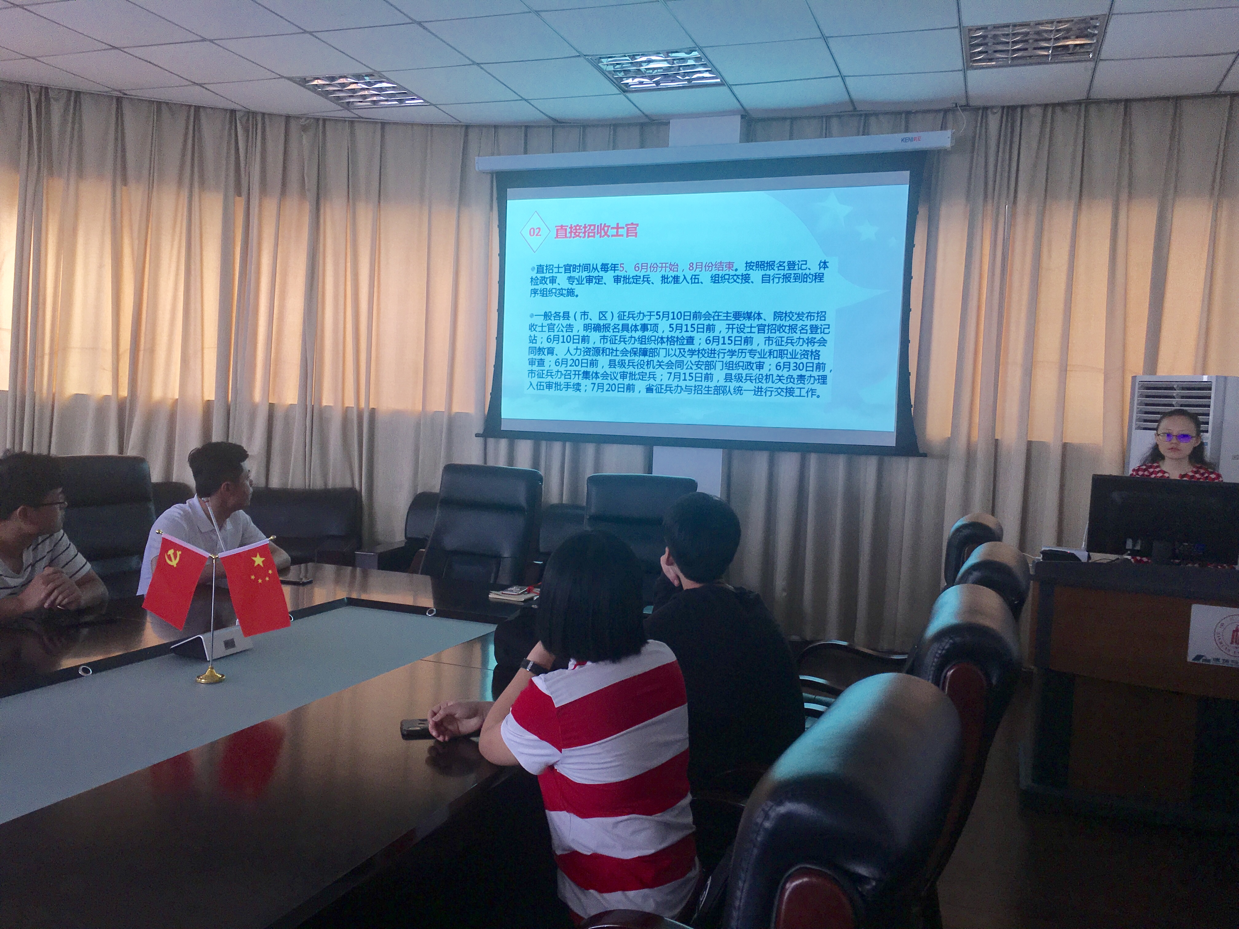 5月份,学院学生工作组制作了专题课件,将《大学生入伍宣讲》和《兵役登记政策解读》以及《国家安全主题教育》结合,集体备课后在《形势与政策》课及时向全体同学进行宣讲。