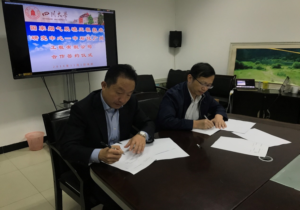 李建军教授主持了工作会议。会议听取了李建军教授的中心情况报告以及烟气脱硫脱硝技术报告、中心主任助理王健礼教授的VOCs处理技术报告,报告指出中心的概况、与中心合作的公司产业合作基地,以及近年来的主要技术成果。随后,中国石化广州工程有限公司副总经理朱兴华和技术总监胡敏对中石化广州有限公司进行了视频介绍,并对催化裂解烟气脱硫脱硝技术进行阐述,对其中包含的详细技术和问题进行了探讨。最后,李建军教授与朱兴华副总经理进行了合作签约,中心与中石化广州工程有限公司在工作方面表示了对对方的充分肯定,并对日后合作发展提出了宝贵意见。