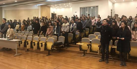 在讲座完毕之后,紧接着就开始了建环人宣誓活动。宣誓的主题是“诚信做人,诚信做事,诚信学习,诚信科研”。在本次宣誓活动的领誓人赖俊瑶的带领下,在场的全体研究生同学紧握右手,进行宣誓。在庄严的誓词中,每个同学都仿佛经历了一次学术精神洗礼,增添了一份责任与承诺。