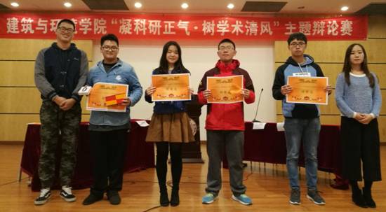 随着宣誓部分的落幕,活动终于进行到了最令人期待的部分,在高老师一鼓励之后,2017年建环学院“凝科研正气,树学术清风”主题辩论赛活动便正式开始了。本次辩论赛将由5位到场嘉宾担任评委,每轮比赛将评选出获胜队伍以及一名最佳辩手。各位选手在赛场上唇枪舌战、你争我夺,为我们展现了一场又一场的美妙的听觉风暴。最后,在经过了双方精彩的辩论之后,1、4班获得了特等奖,2、3班获得了优秀奖,赵芯宇、刘侃获得了最佳辩手的称号。