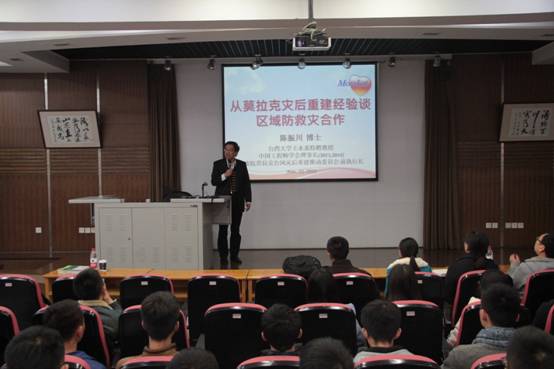 11月22日14:00,光华教育基金会及唐奖教育基金会执行长陈振川教授在建筑与环境学院二楼报告厅进行了题为“大灾害后重建经验谈区域防救灾合作”的学术讲座。讲座由学院院长熊峰教授主持,来自学校规划处副处长李碧雄教授、新能源与低碳研究院副院长谢凌志教授以及土木系老师丁志斌、张瑶、葛琪、赵鹏等老师、学生辅导员谢伦武老师及土木系学生参加。