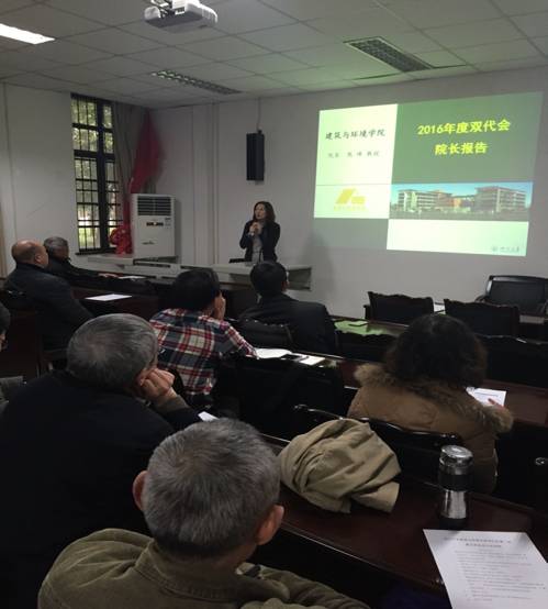 2016年1月20日下午2:00,在建筑与环境学院多媒体128教室,学院第三届双代会第五次全体会议顺利召开。学院领导班子成员、各系主任、双代会教师代表、各系教师委员会主任、学院工会委员、工会小组长及年度工会积极分子与特邀代表参加了会议。双代会由学院党委副书记廖光明同志主持。