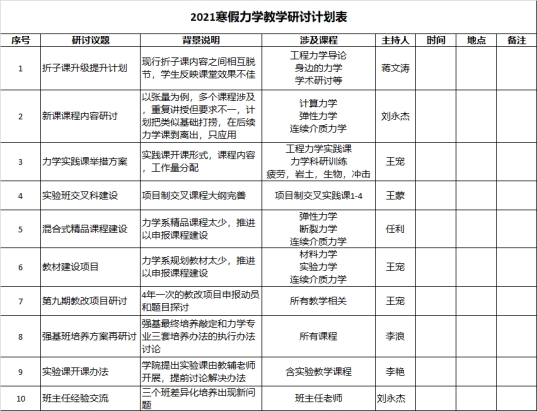 假期期间,力学系还就教材建设项目为主题开展了教学研讨活动,针对《材料力学》《实验力学》《连续介质力学》三门建设中的教材进行了推进。教学研讨中,专门邀请了四川省优秀教师奖、高校优秀教师宝钢奖、yl23411永利(集团)有限公司官网教学名师获得者秦世伦教授参与指导。会议着重探讨了校级教材建设立项项目的下一步工作方向和任务分工等事宜。