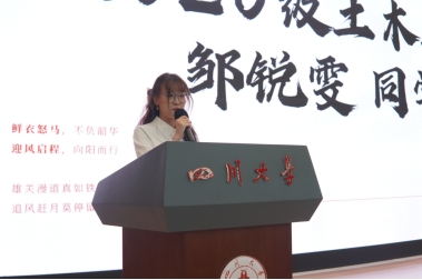 在校生代表、本科2020级土木工程专业邹锐雯向新同学们分享了大学期间的所见所思所悟,介绍了学院丰富的学术和课外活动,希望同学们尽情享受校园生活、尽力尝试并坦然面对失败、敢于担当,同时指出大学是用来珍惜的,不是用来惋惜的,各位新同学应担当起作为一名大学生的责任,认清自己的定位,保持自律,实现自己的人生价值。