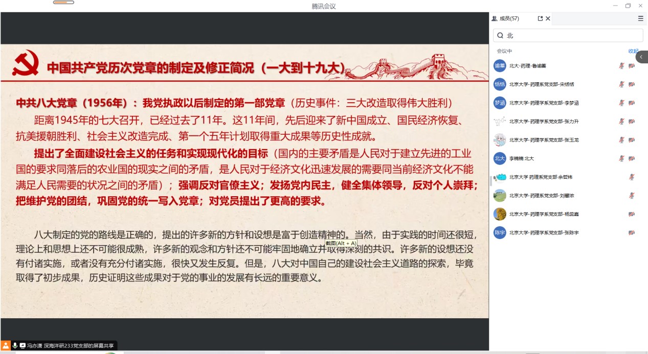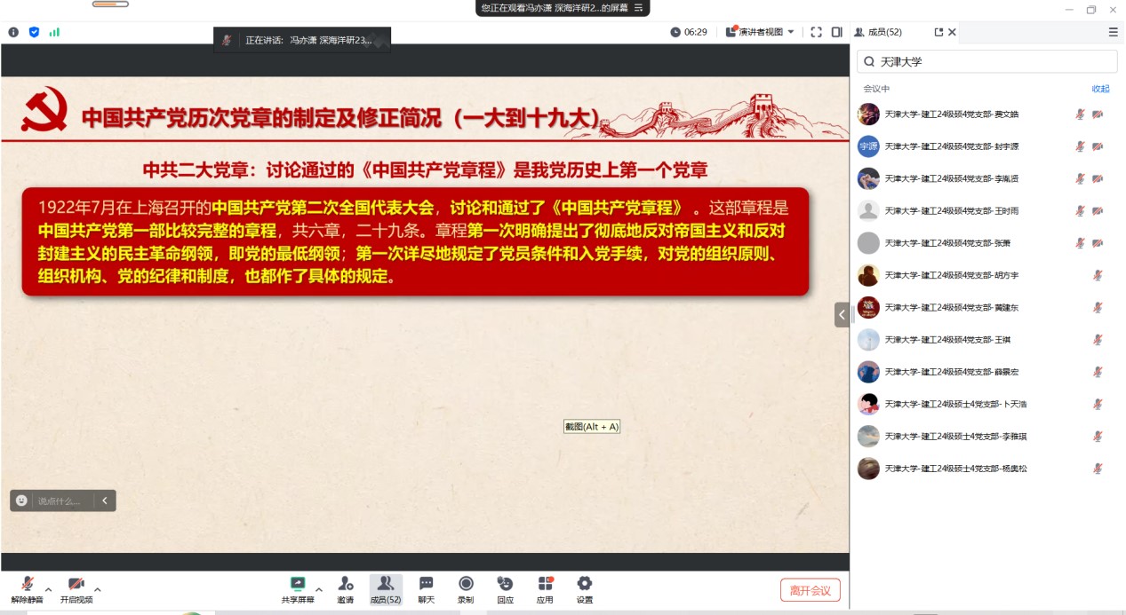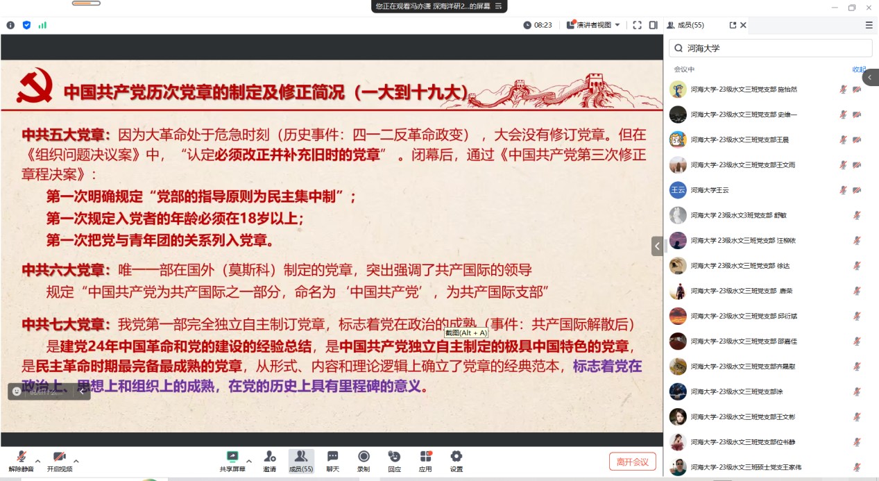 为深入学习贯彻党的二十大精神,推动高校党支部间的交流共建,2025年1月3日研究生土木二支部联合清华大学国际研究生院深海洋研233党支部、国际研究生院深海洋研43党支部、北京大学基础医学院药理学系研究生党支部、天津大学建筑工程学院24级硕4党支部和河海大学水文水资源学院2023级水文三班硕士研究生党支部,共同举办 “学党章明党史守党纪”专题活动。