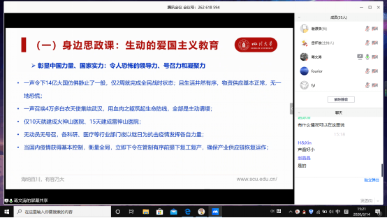 讲座中,蒋文涛结合本次新冠肺炎疫情,为同学们深度剖析了疫情现状,中国如何做到“一方有难,八方支援”的慷慨壮举,以及身为大学生应该如何学会积极应对,坚持“停课不停学”,听从党和国家统一指挥,为国家发展与社会进步贡献力量。