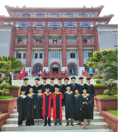 座谈会后,建环学院领导、退休老领导、力学系教师代表和77/78级返校校友在学校行政楼前合影留念,同时各位77/78级返校校友身着学士服补拍了毕业照。
