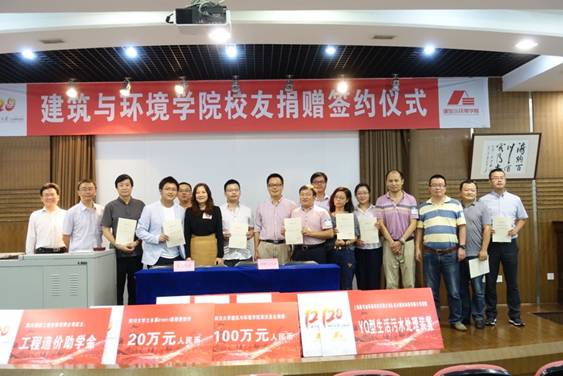 当日接受学院颁发捐赠牌、捐赠证书并与学院签订捐赠协议的校友代表依次为上海康考迪环保科技有限公司、四川建环科技有限公司代表龚敏校友,yl23411永利(集团)有限公司官网土木系“土木系复建三十周年纪念石”代表王跃翰校友,2002级土木三班捐赠助学金代表石宵爽校友,1988级环境监测班助学金代表杨品杰校友,内江市英汉商贸有限公司代表何英汉校友,土木系19910911班捐赠助学金代表刘炜校友,北京纬伦华业环保有限公司代表李国文校友,环境系1990级全体同学T恤捐赠代表王东尔校友,四川创信工程咨询有限公司代表阳南校友。学院院长熊峰教授、党委书记陈勇同志与校友代表们一一签约并合影。