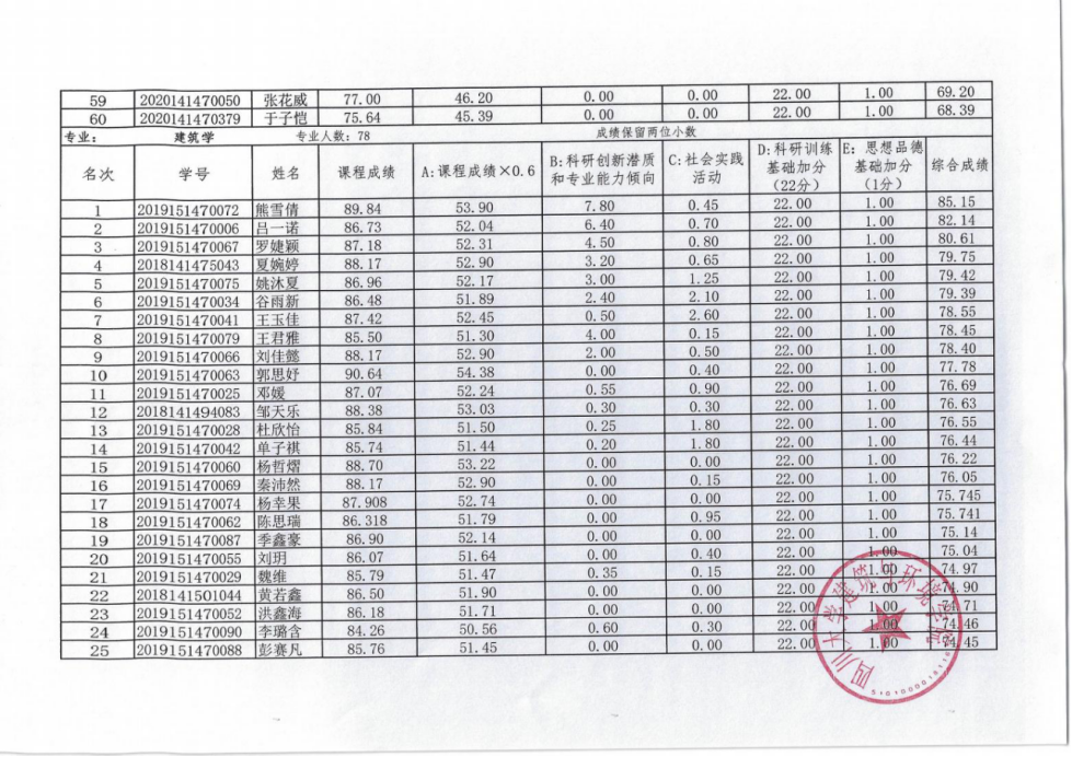 经过建筑与环境学院成绩计算、专家审核,现将我院2024届推荐免试研究生综合成绩公示如下,公示时间由2023年9月15日至9月18日下午17:00。