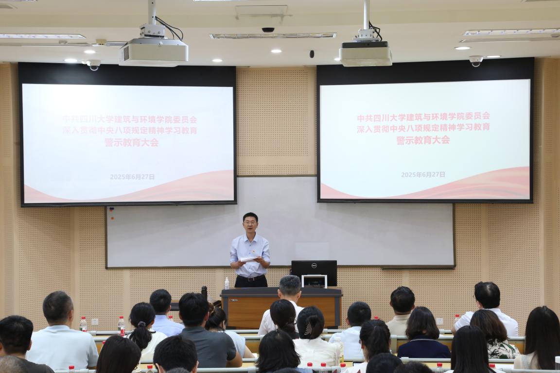 按照学校深入贯彻中央八项规定精神学习教育工作要求和学院学习教育实施方案,6月27日,学院在望江校区研究生院一区204教室召开深入贯彻中央八项规定精神学习教育警示教育大会。学院全体教师党员参加会议,会议由学院院长戴峰主持。